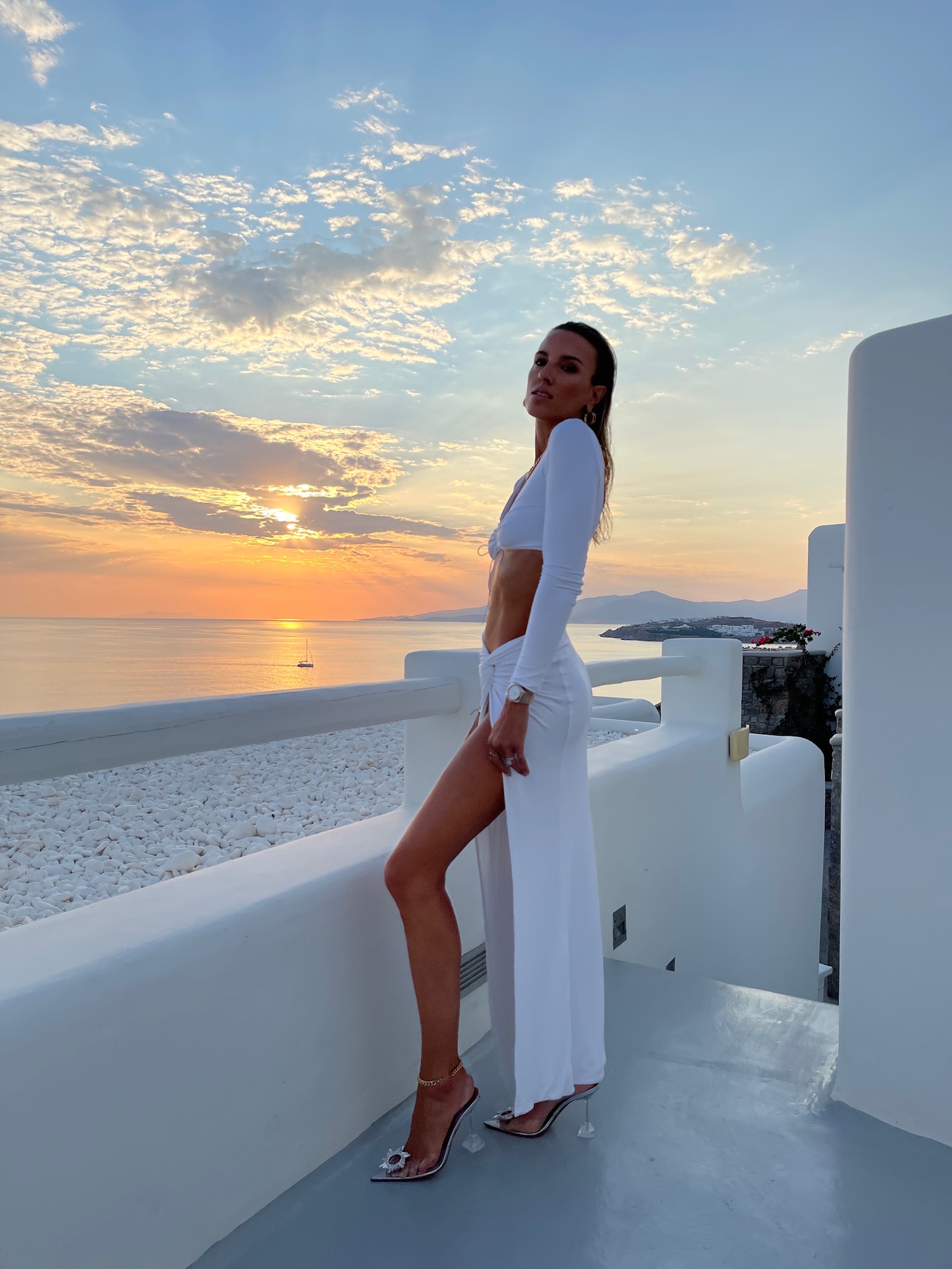 natalie rolt, clementine set, natalie rolt clementine set, white matching set, natalie rolt white set, sunset photoshoot, amina shoe, amina muaddi, cinderella shoe, greece vacation style inspo