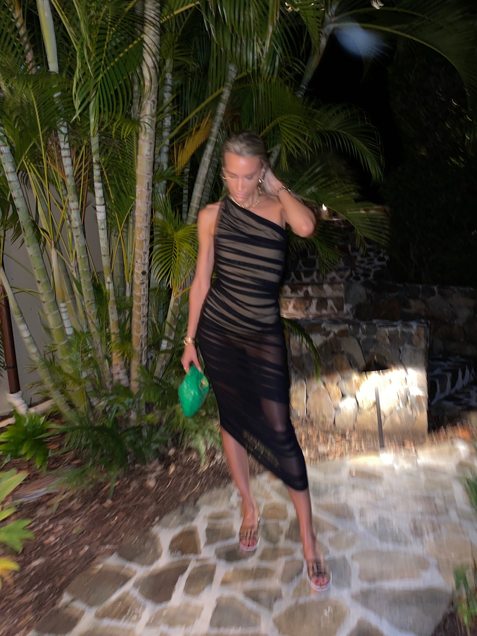 norma kamali dress, norma kamali, black mesh gown, norma kamali mesh gown, chanel sandals, bottega veneta bag, bottega veneta jodie bag, bottega veneta green jodie bag, electric picks