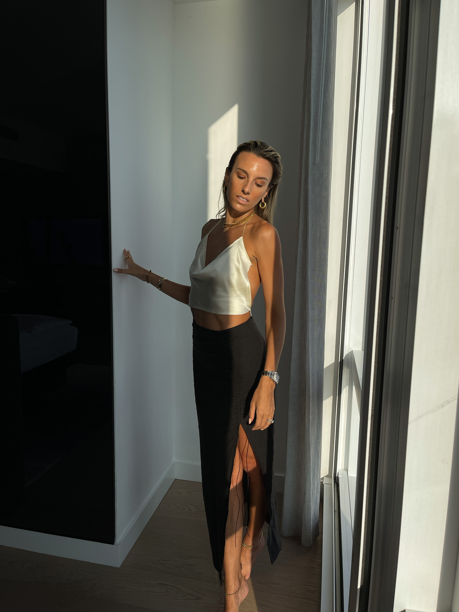 subsurface tv top, strappy ivory cami, open back cami, natalie rolt skirt, natalie rolt midi skirt, hey maeve earrings, equinox hotel, equinox hotel nyc