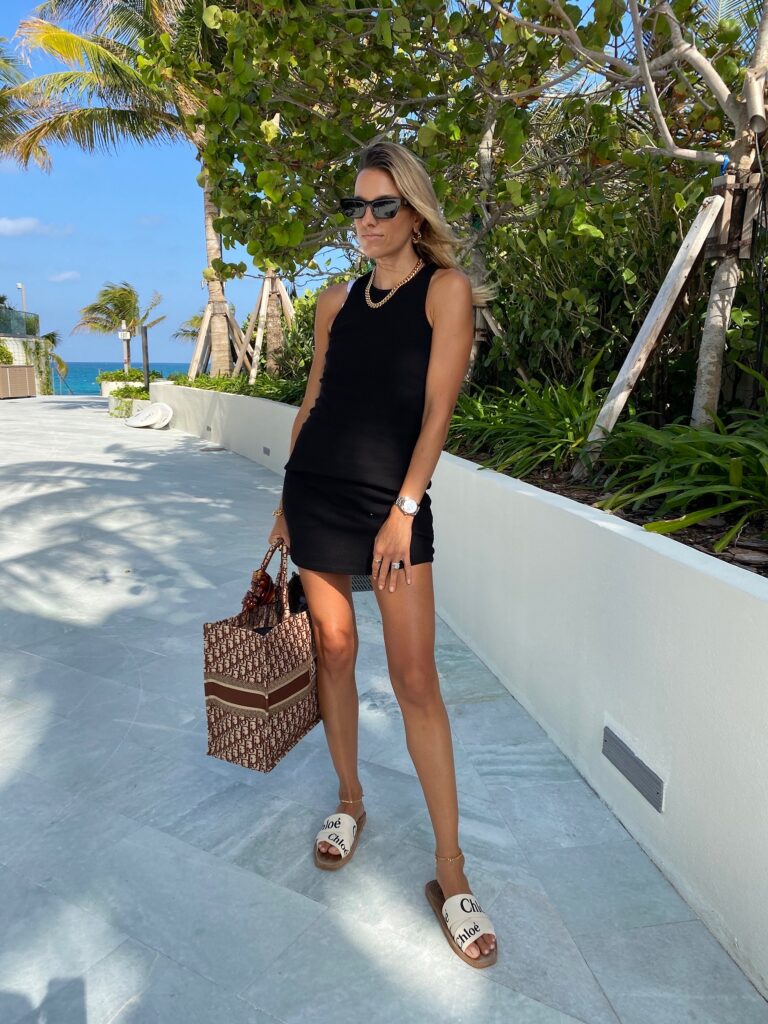 Dress: Monrow | Shoes: Chloe | Sunnies: Linda Farrow (similar here and here) | Earrings: Hey Maeve (similar here) | Necklace: Past Midnight (similar here) | Anklets: Electric Picks (1,2) | Tote: Dior