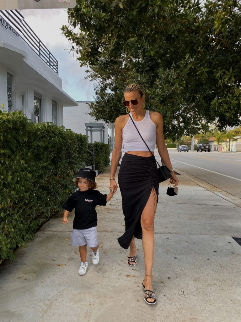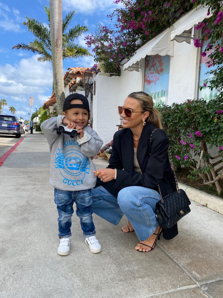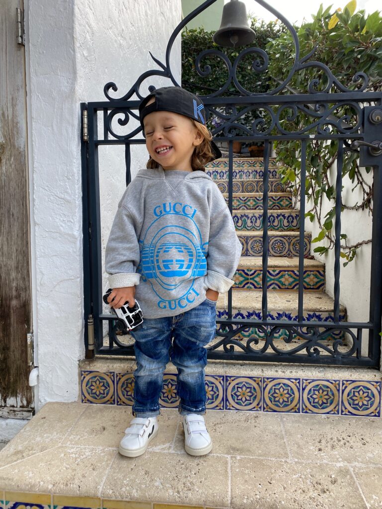 The reversible Molo bucket hat is perfect for him while we are living in Miami and matches with everything. The Balenciaga t-shirt looked absolutely adorable and fits him perfectly. We love to invest in designer pieces that are versatile. He has these Mayoral grey sweat shorts in black as well – they are that good and super affordable for the quality. I love the detail on the back pocket! Sebastian wears these Golden Goose sneaks on repeat – super easy for us because of the velcro! If you are a mama, you definitely know what I’m talking about 😉 He kills me with how cool he is lol!